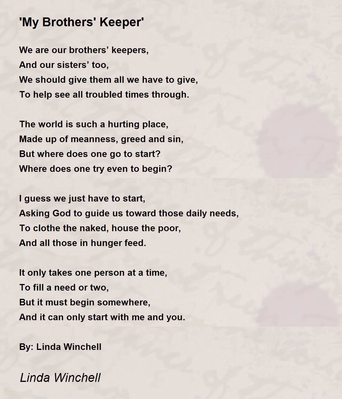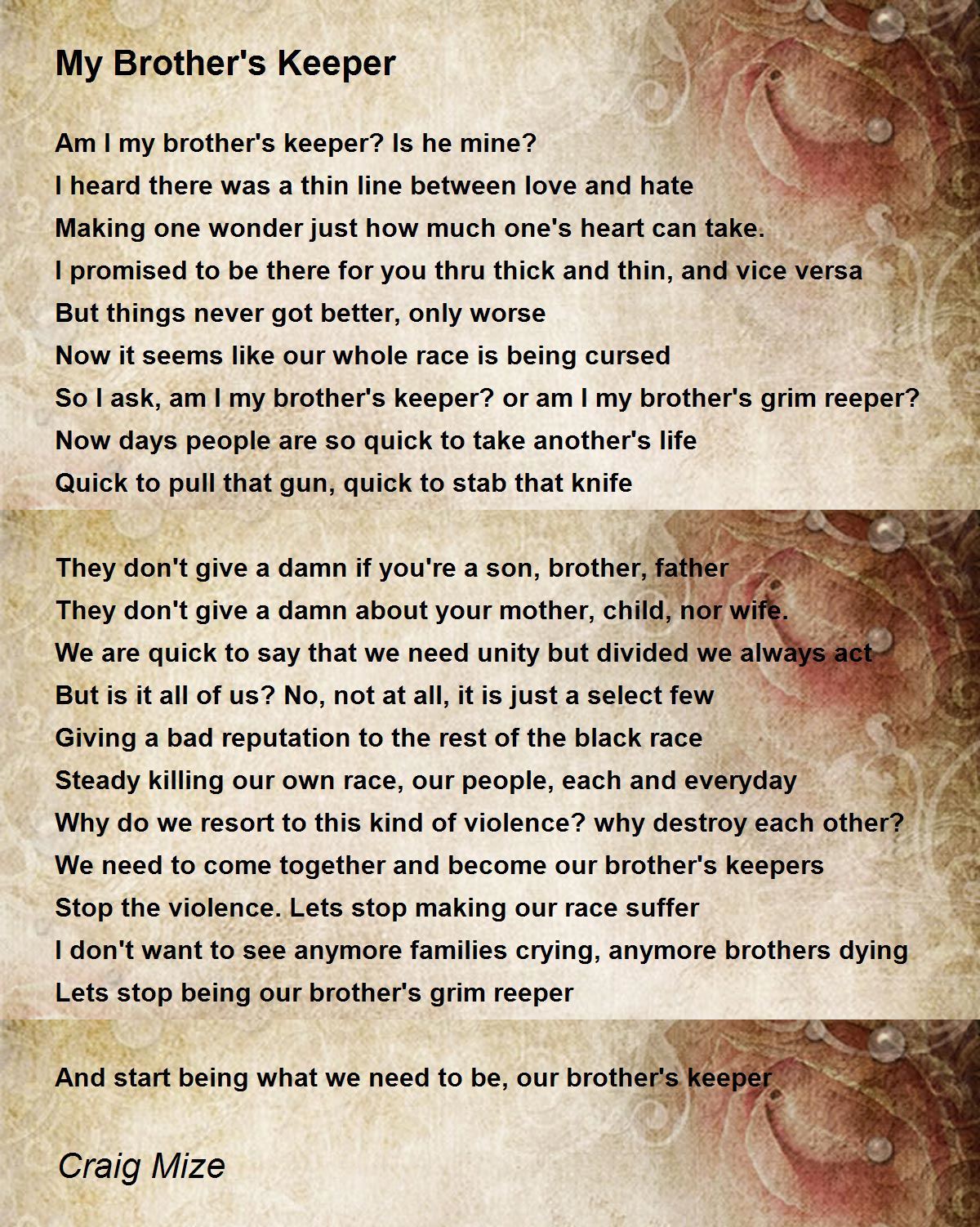 I am my brothers keeper says the chickenshit liberal. I am my brother s keeper quote. Jeffrey R Holland Quote Although I May Not Be My Brother S Keeper I Am My Brother S Brother And Because I Have Been Given Much I. Except me as your keeper theres been a change of plans be careful of what you speak of Ive come to understand. I whisper every word she needs to hear and I. The phrase my brother s keeper occurs in the context of the story of cain and. Bible verses about I Am My Brothers Keeper. There are a few different interpretations of what my brothers keeper really means. Brothers Keeper Quotes Showing 1-17 of 17.